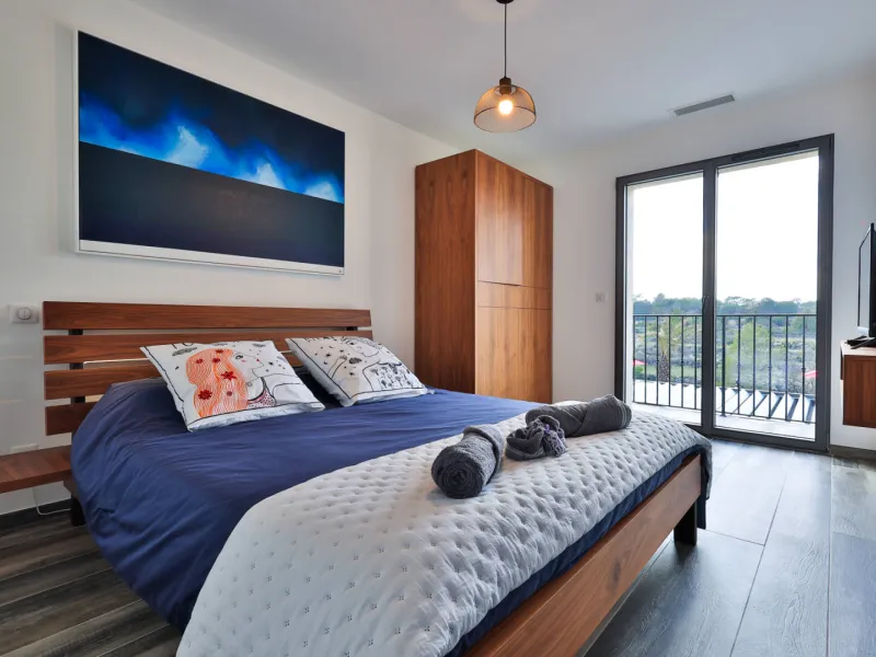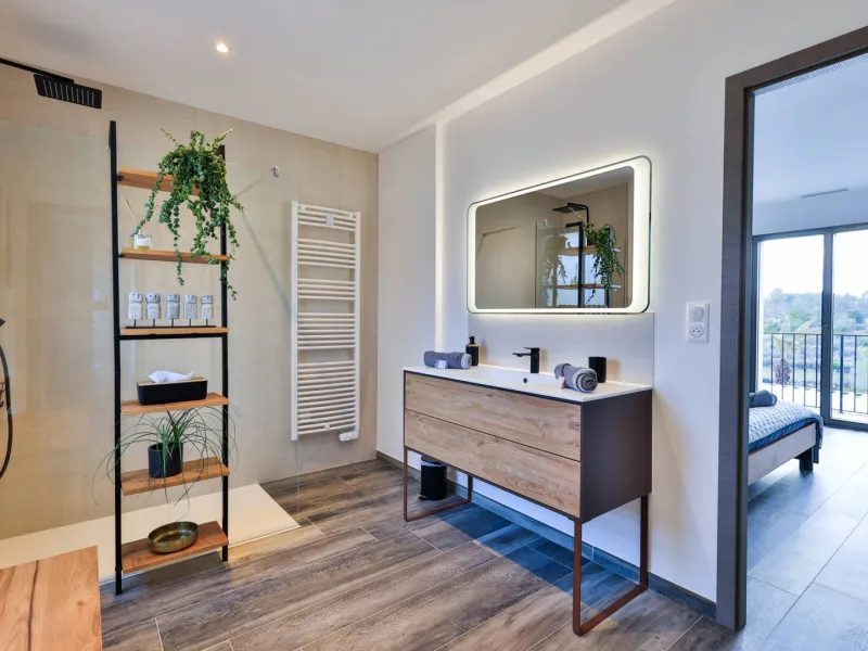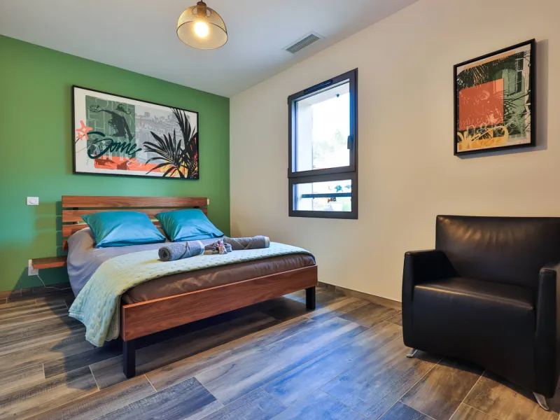Room Niack: 25m² facing east, bed 140x200 memory, bathroom with double sink and walk-in shower.