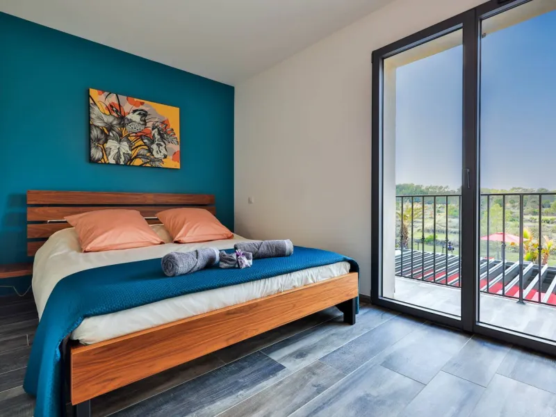 Missy room: 22m² facing West with balcony pool view, 160x200 memory, bathroom with double sink and walk-in shower.