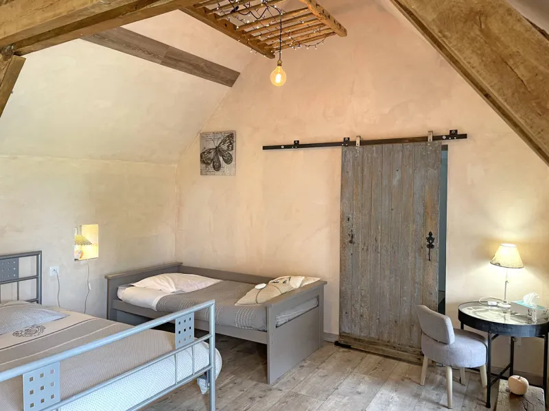 In its continuity, the room of the accessible Bergerie (PMR) has been arranged with a bed in 140 and 2 beds 90 gigognes (walk-in shower and toilet) for up to 4 people.