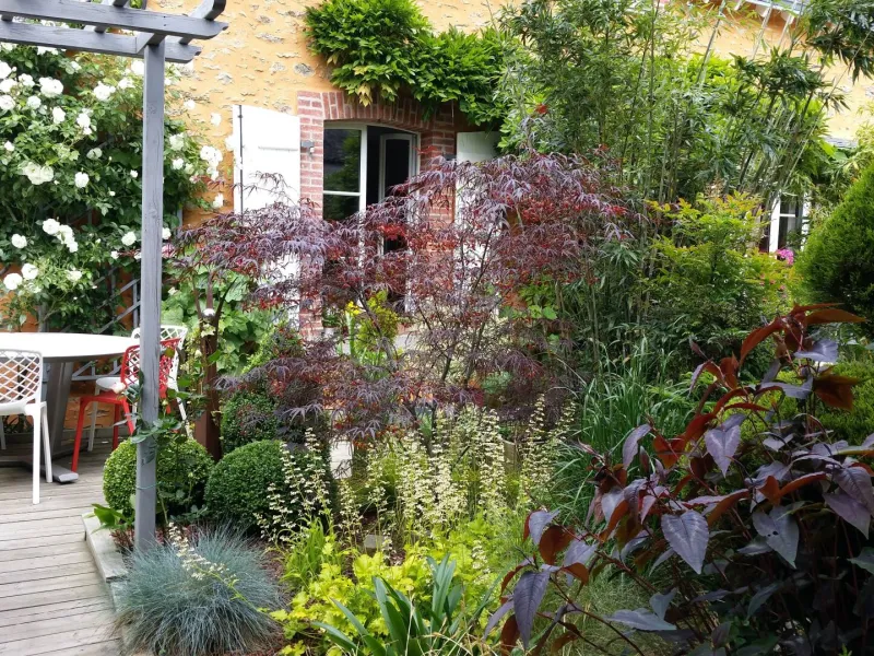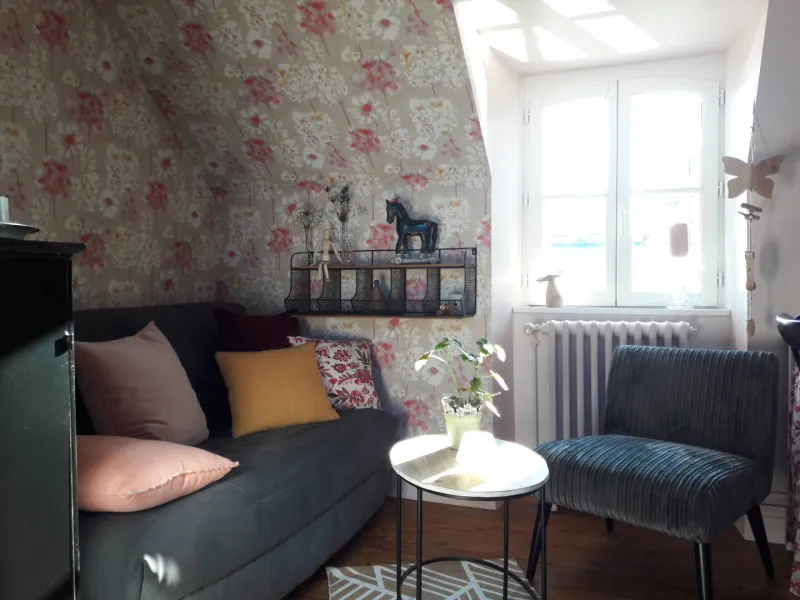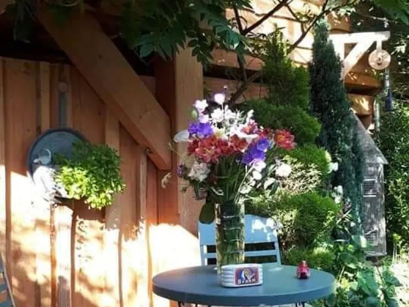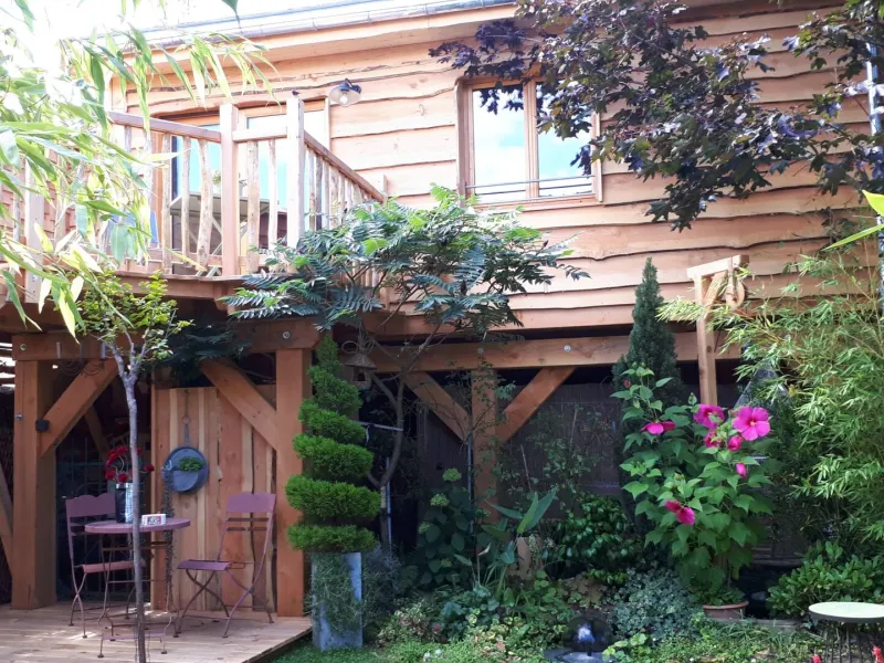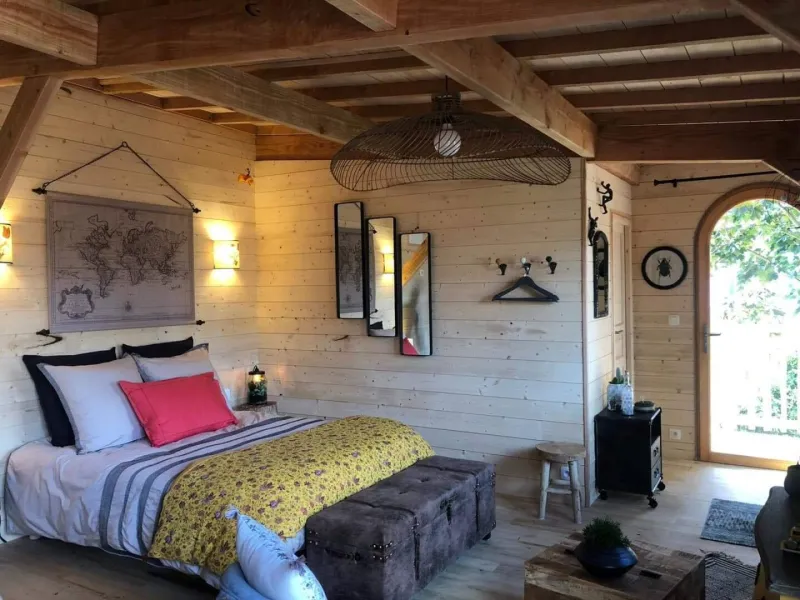 Situated at the bottom of our flower-filled garden, easily accessible by a staircase skirting the maples, the Cabane du Bon Chemin, heated and insulated, offers a 26m2 space for your comfort, with TV and free Wi-Fi, including a cosy sleeping area: 1 double bed (140x190) and 1 pull-out bed (90x190). A fully-equipped kitchen area for longer stays, plus a bathroom with a large walk-in shower, washbasin and WC.