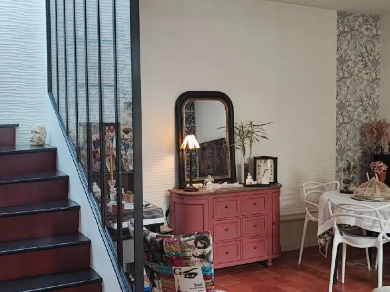 A bay window opens onto a 7m² private terrace on stilts, covered by a glass roof overlooking the garden and pond. It offers a view of our stone house. A staircase leads to a second shaded terrace on the garden level, ideal for relaxing and enjoying nature.