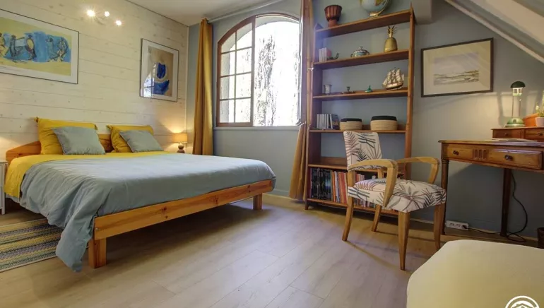 4 km from the center of Belley, Pascal and Brigitte, open the doors of their Bugiste house and offer you two bedrooms located upstairs. From the hall, you access the bedrooms by a wooden staircase, which leads to a first bedroom for 3 people with a 160*200 bed and a 90*190 bed. The second bedroom, adjoining the first, has a 160*200 double bed. The two bedrooms are each equipped with a bathroom (with WC), private to the bedroom but not adjoining (toilets in the hallway). Bathrobes are available for added comfort. This floor includes the two guest bedrooms, as well as a private space for the owners (office and a bedroom reserved for the family).