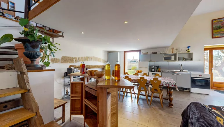 B&B accommodations in the Coteaux du Lyonnais area, facing the village of Bessenay (the French capital of cherry). Leafy setting, near city of L'Arbresle. Each bedroom has a separate access and own terrace overlooking the orchards (in spring they are covered with flowers which will give delicious cherries later). Reserved for guests : large living room, lounge on the mezzanine, kitchen area. Self-catering accommodation on the premises. All accommodations can be booked jointly for a family gathering (15 people). 3 guest rooms on 1st floor, each with private terrace. Room 1 'BURLAT DE BRUSSIEU' : 2 single 90 x 200 cm beds + 140 x 190 cm double bed on the mezzanine. Room 2 'GRIOTTE DE COURZIEU' : 160 x 200 cm double bed + 140 x 190 cm double bed on the mezzanine. Room 3 'BIGARREAU DE BESSENAY' : 160 x 200 cm bed + 140 x 190 cm double bed on the mezzanine. All mezzanine are accessed via ladder so unsuitable for young children. Shower room & separate WC in each room. One room has bath and dual washbasins. Cot on request. Guest living room with lounge area on mezzanine (books, board games, TV). Terrace, set of boules, swings, parking. Meals can be ordered and delivered from local restaurant. Special fare for group of 15 people, renting all rooms (bed linen supplied) or renting all property (self-catering terms). Payment by holiday vouchers or credit cards allowed. Rate for extra person in room (except child under 10 years) : 15 euros/night/person. Charging station (T2 type) for electric cars available.