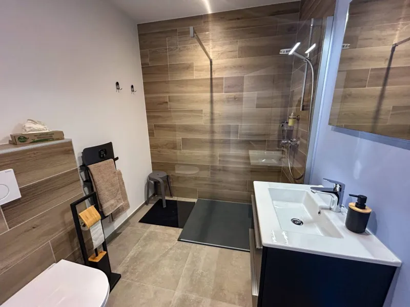 Private bathroom: shower and washbasin adapted for PRM, WC.