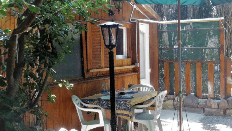 En rez-de-jardin, un hébergement style chalet, très bien isolé. Terrasse privative. Cours et jardin fleuri ombragé avec balancelle et mobilier de jardin. Couchage canapé convertible type rapido (confort). Cuisinette wc douche privative.