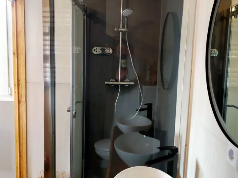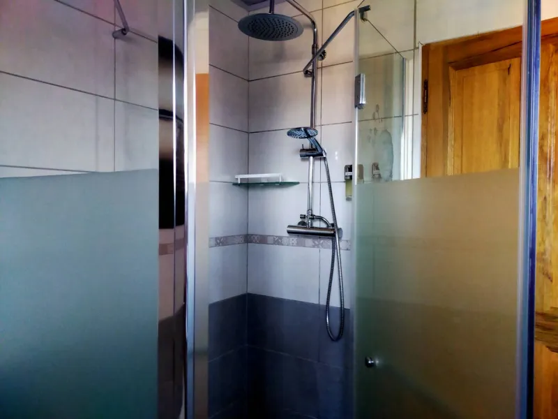 The bathroom is equipped with a large shower and a whirlpool bath.