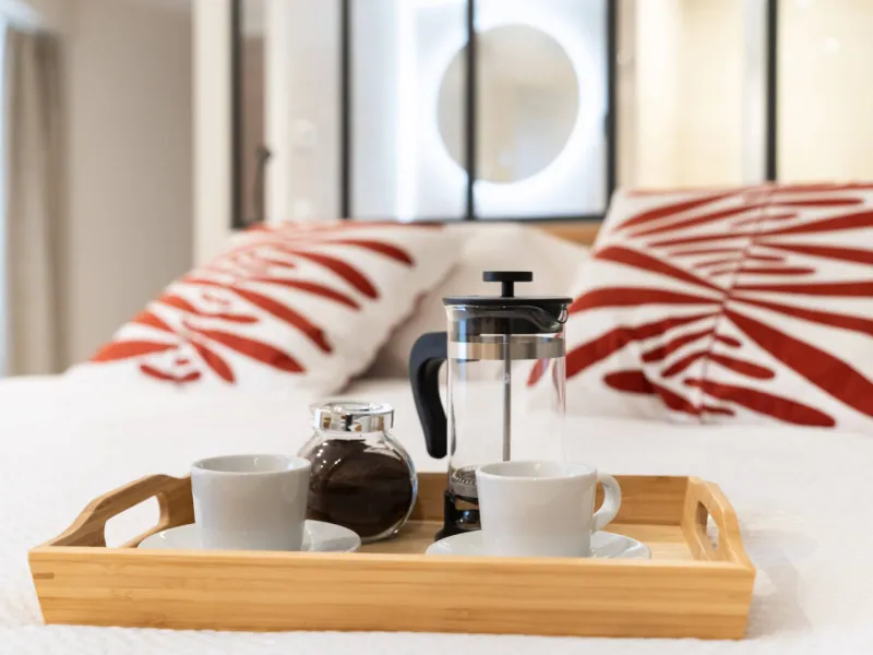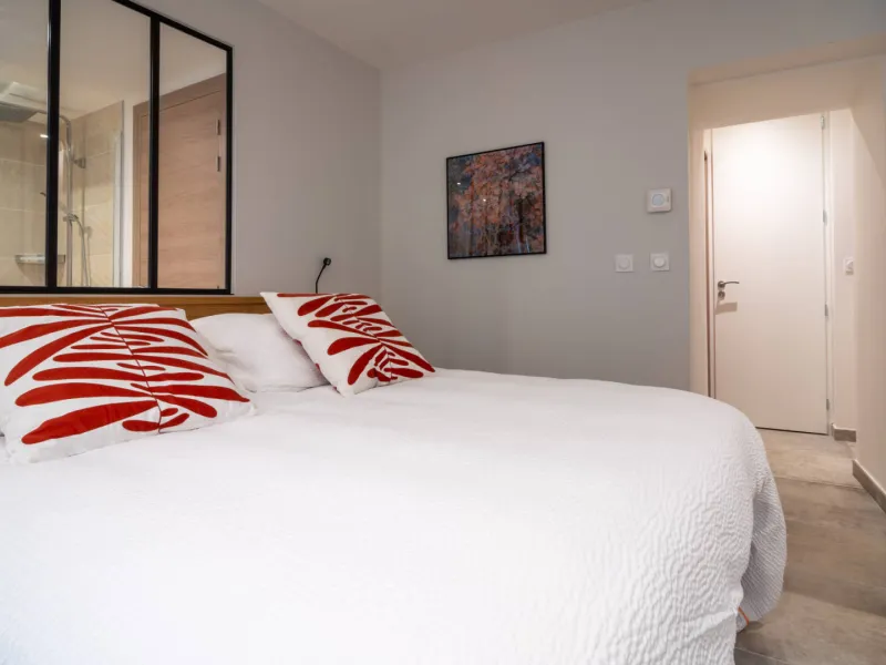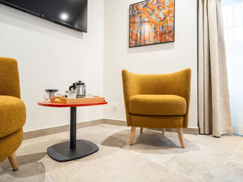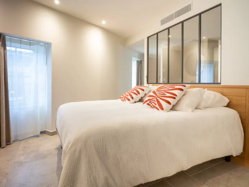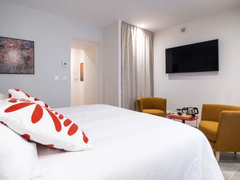 Our recently renovated room in 2024 offers an exceptional level of comfort with a queen-size bed, equipped toilets with Japanese features, and a separate shower room. Enjoy our common courtyard to sip on an aperitif or fruit juice, lulled by the gentle murmur of the fountain.Your well-being is our priority with centralized heating and air conditioning, a double-flow ventilation system, mosquito nets on windows, a minibar, a safe, a smart TV, and high-speed Wi-Fi.