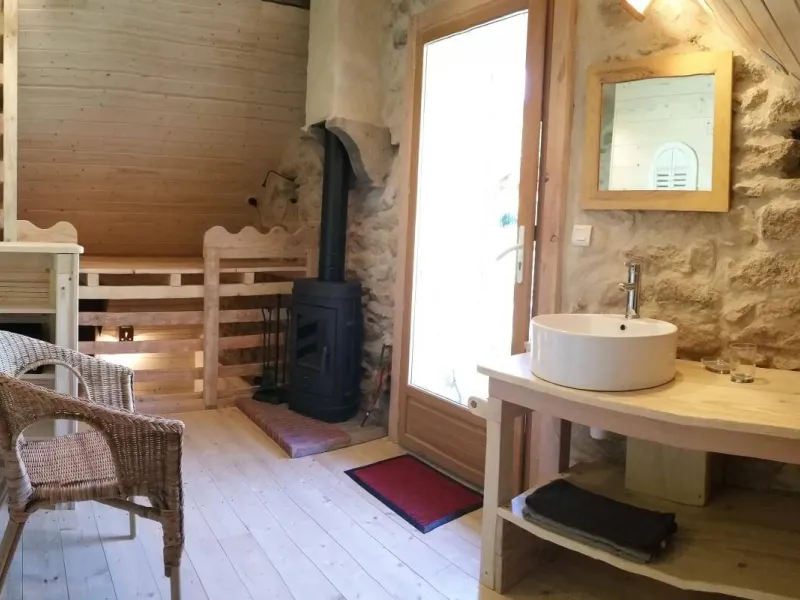 This spacious room (35 m² + 20 m² with duplex) is ideal for couples, families or groups, with its south-facing terrace and peaceful setting. Cosy sitting area around the wood-burning stove.
