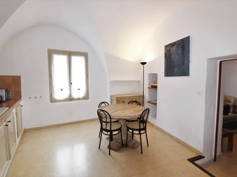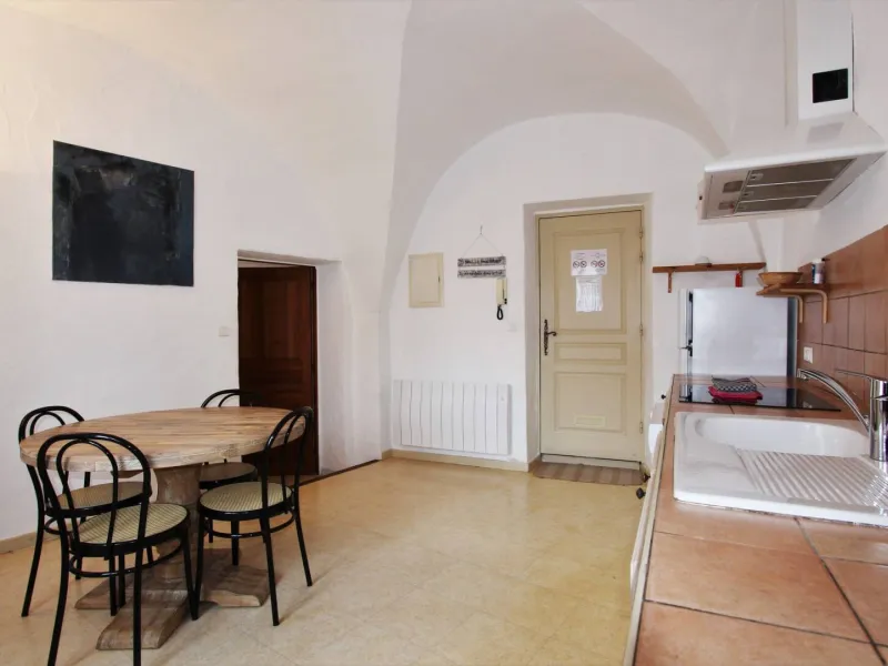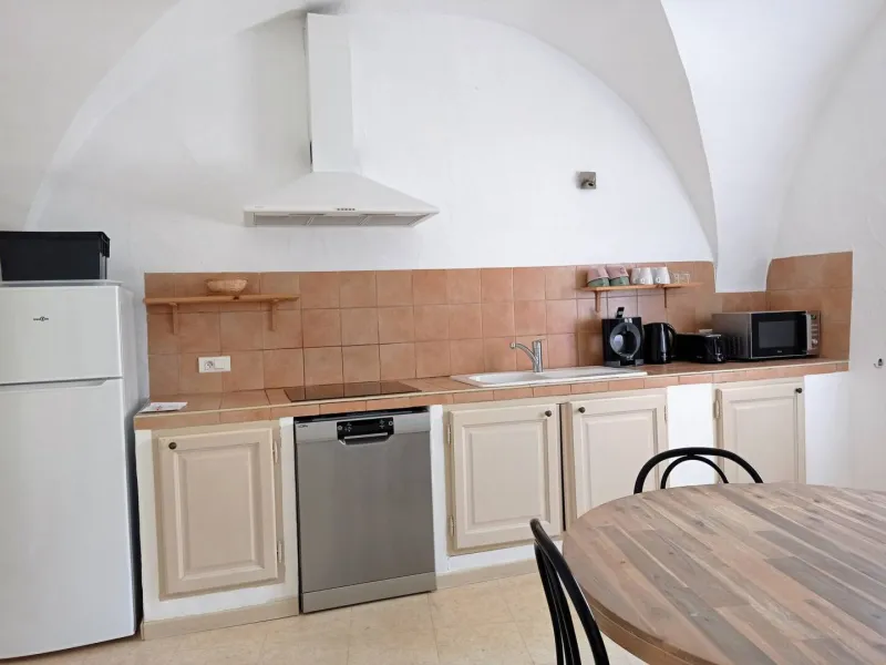 Conçu pour héberger deux personnes, ce gîte de 50 m² se trouve au rez-de-chaussée de la bâtisse. La cuisine est agrémentée d'une superbe voûte en ogive. Les espaces communs de la propriété sont accessibles depuis la cuisine, tandis que la porte-fenêtre de la chambre offre une vue directe sur le village. L'espace salon aménagé dans la chambre offre un coin de détente baigné par la lumière naturelle de la porte vitrée.