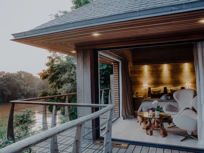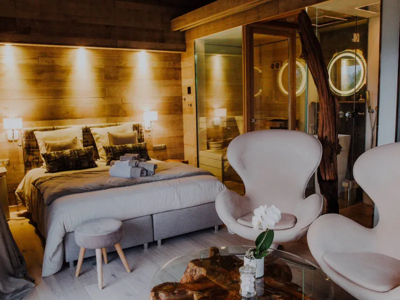 Our Sauna Lodge is a cocoon nestling in the trees, facing the river, totally dedicated to well-being!This wooden building on stilts is a haven for couples looking to recharge their batteries. A traditional sauna is in your room! It offers a magnificent view over the charming port of Grez Neuville.