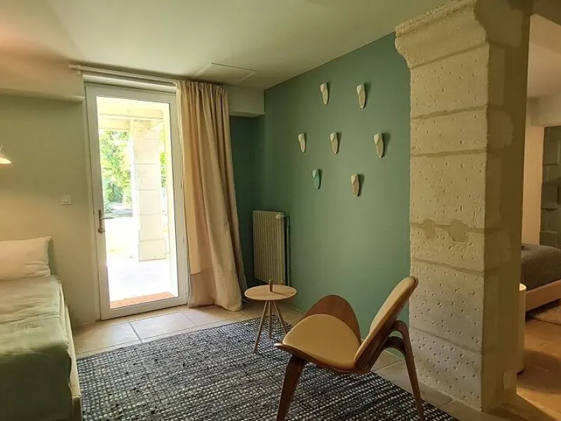 Chambre Pastel, double suite with King-size bed and 90 cm bed for an additional person, garden view, small shaded terrace with table and chairs.