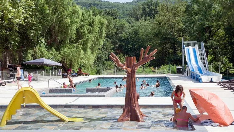 Organised activities in summer: superb aquatic area with large heated swimming pool (22x9m) including a spa area and bubble beds, a two-lane slide, a paddling pool (10x5m) with water games, fishing, tennis, volleyball, games room (coffee games, billiards, table football. .), 2 children's play areas, floodlit bowling green, basketball, football, outdoor fitness area, car, bicycle and pedal go-kart hire, library, farmyard, donkey rides, games library,