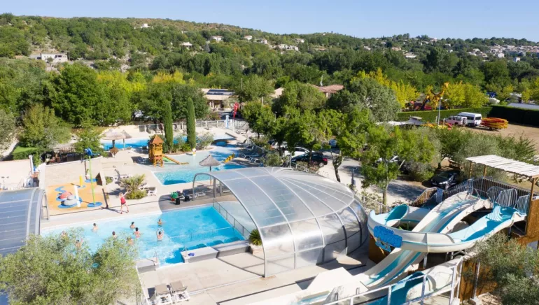 Situé au dessus de la rivière Ardèche, avec un accès direct à une grande plage, vous pouvez aussi profiter de l’espace aquatique avec 4 bassins chauffés dont un couvert avec banquettes balnéo et aqua-bikes, et une pataugeoire avec jeux d’eau pour les plus petits. 3 toboggans aquatiques complètent cette offre.