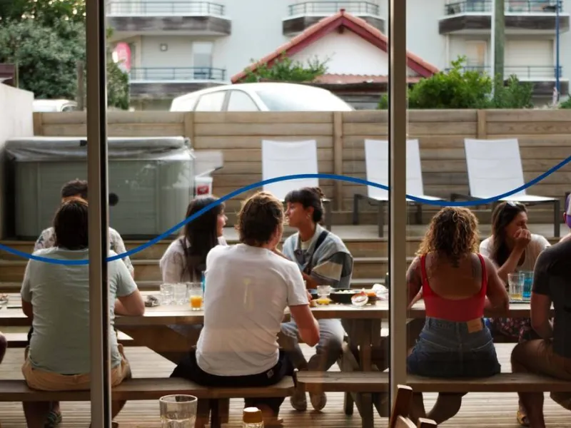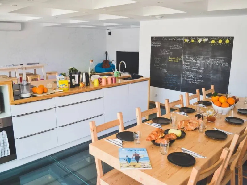 We propose you on the one hand a beautiful private apartment with ocean view and adjustable in 4 or 9 beds and on the other hand 1 bedroom of couple and/or 12 beds divided into 2 dormitories of 6 persons with a large terrace and living room kitchen. The 100m2 terrace allows you to meet people of all nationalities to share some great surfing sessions or other adventures.... Breakfast, surfboard, wetsuits and skateboard are included in the price of the night. Common meals are organized according to the wishes of our guests as well as a possible pick-up at the airport of Biarritz or at the train stations of Bayonne and Dax. Xavier, master of the place and his father "Popeye" guarantee you the best welcome as well as the best advice for outings and surfing sessions... Spa / jacuzzi / sauna / hammam at your disposal.Localisation