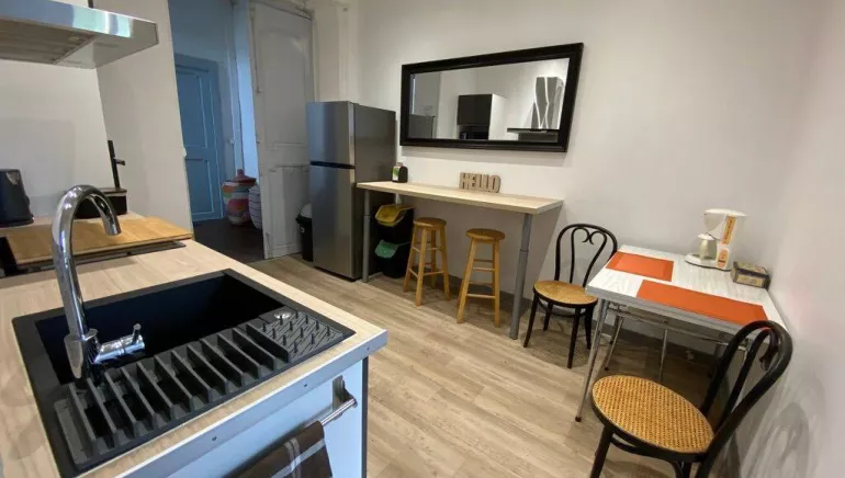 Le logement comprend une cuisine lumineuse avec cuisine intégrée, éléments intégrés (Micro-ondes, four, plaques, réfrigérateur congélateur), avec espace repas (table et chaises et mange debout 4 personnes). 2 dortoirs : 1 dortoir Tarn (2 lits 0,90 x 200) 1 dortoir Garonne (2 lits 0,90 x 200), 1 salle d'eau et 1 wc indépendant. Une salle d'eau supplémentaire au 1er étage réservée au gîte d'étape avec douche, lavabo et wc. Accès à une salle de lecture au 1er étage. Wifi dans le logement. Draps housse et taie d'oreiller fournis compris dans le prix, et linge de toilette fournis et drap plat en option. Possibilité d'un forfait sèche linge sur place en option.