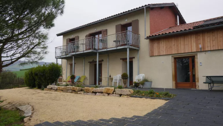 Large gîte for 15 people, ideal for family/friends or professional gatherings. Close to the city of L'Arbresle, very easily accessed, less than 1 kilometer from the village. Extensive grounds with lovely views of Bessenay, the countryside and orchards of cherry trees. Disabled access. Renovated respecting Low Consumption Building standards. 2 adjoining buildings : 1 gîte + 3 guest rooms. Ground floor (single level) : large living room (kitchen/ lounge/ dining areas, wood pellet stove), separate WC. Connecting door leading to the gîte (same level) : living room with kitchen area, 2 bedrooms (double bed) (2 single beds), shower room. WC. Upstairs : lounge (skylight, TV) on the mezzanine of the building including guest rooms, 3 bedrooms each one with private facilities. Double beds or single beds, mezzanine with double beds. Each bedrooms opens directly onto balcony with garden furniture. Terraces facing South, garden with play area, boules alley. Parking. Breakfasts on request. Can be hired for seminars. Warm welcome from the owners living in detached house at the back (no opposite neighbours, peaceful setting). Owners will do their best for you to spend a stay as pleasant as possible. Charging station (T2 type) for electric cars available.