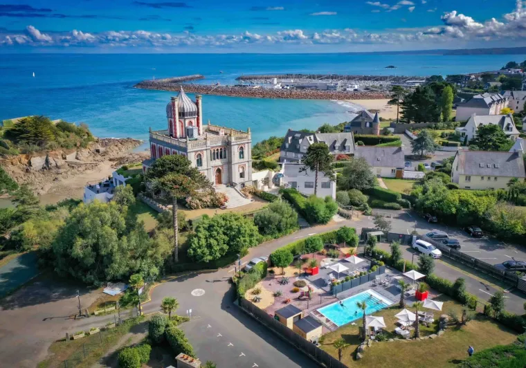 Manager Jean-Luc says that "Time seems to stand still", in this hotel tucked away on the cliffside, well away from main roads, and quite logically one of the 'Relais du Silence' hotel chain. The hotel complex is very modern, with striking, slightly oriental-looking upper storeys. Each of the 27 rooms has a terrace that looks out onto Saint-Brieuc bay, and the Manager can confirm that "you can even see the sea from your bed!" thanks to the wide picture windows. A generous breakfast is served in the breakfast room or your bedroom, and the GR34 hiking trail runs straight past the door. A flight of steps leads down to the beach and you can even get to the ‘Ile de la Comtesse’ at low tide, where there was once a botanical garden belonging to the famous cosmetics and perfume creator, Eugène Rimmel.Localisation