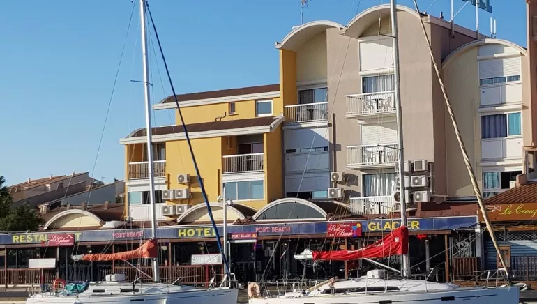 By the marina, in the busy resort centre, the 3-star hotel PORT BEACH is open from March to November.
