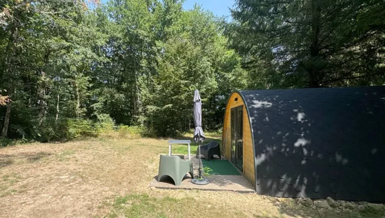 Our nesting boxes (Pods) on the edge of the forest, named after some of the birds present at Domaine de Lallé, are fully equipped and fitted out for 4 people. In Le Coucou Gris, which has a terrace overlooking the forest, you'll find a double bed and, in the living area, a comfortable sofa bed. A private kitchen is equipped with a two-burner hob, a fridge and, of course, a coffee machine and kettle. You'll also find a toilet and washbasin; the showers are located in our brand-new sanitary block.