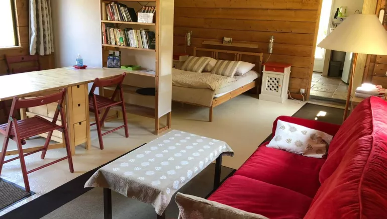 1 large living room with 1 bunk bed for 2 people and 1 bed for 2 people, kitchen, separate shower room and toilet, private parking.