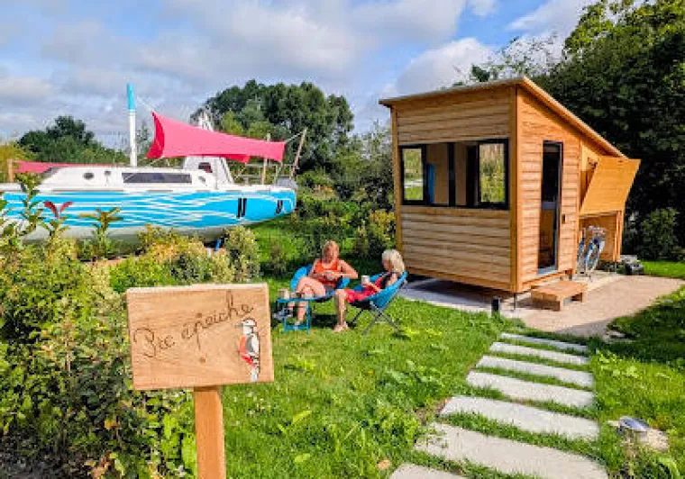 We offer a unique experience for lovers of nature and itinerancy: the cyclo-lodge. This atypical wooden accommodation has been specially designed for cyclotourists, but is open to hikers and vacationers wishing to enjoy a weekend or longer stay.This ergonomically designed accommodation offers a pleasant, modular "living area" (4m²), and a comfortable "sleeping area" (4m²) with 2 90x200cm mattresses, suitable for 2 friends or a couple with a young child. The bedroom can be closed independently with a canvas and mosquito net. there's also a safe for your belongings.
