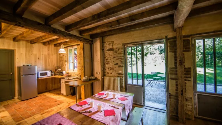 The eco-gîte nestled in the 4 ha park of the Domaine du Colombier is equipped for 6 people with 3 bedrooms (1X2pers, 4X1pers) including one accessible PMR room.
