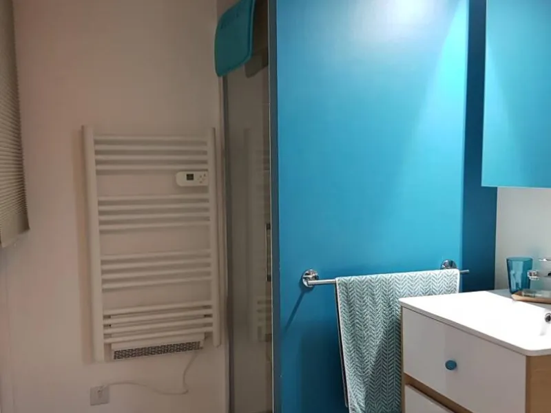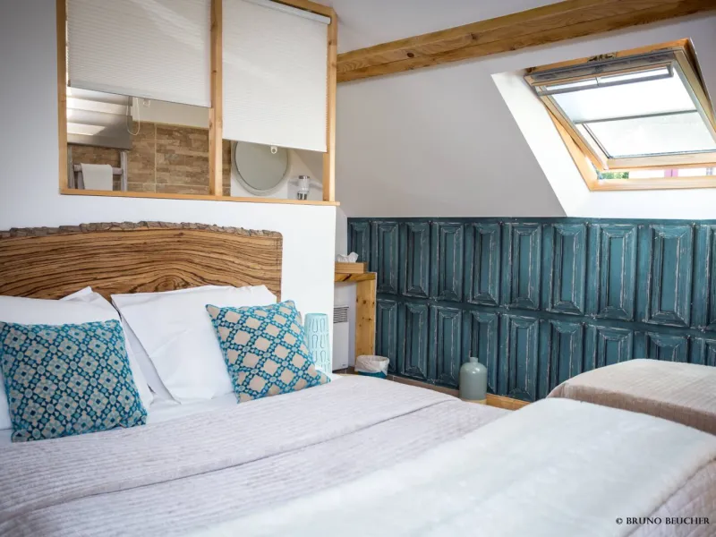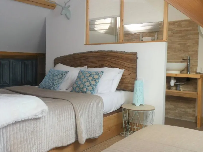 1st floor: a mountain interior, revisited and original, gives this room (2/3 people - 1 double bed, 1 single bed), a very trendy and warm look. The subdued shower room on the night area is soft and practical. Its small office area equipped with wifi will allow you to work away from any hustle and bustle while enjoying the pool nearby.