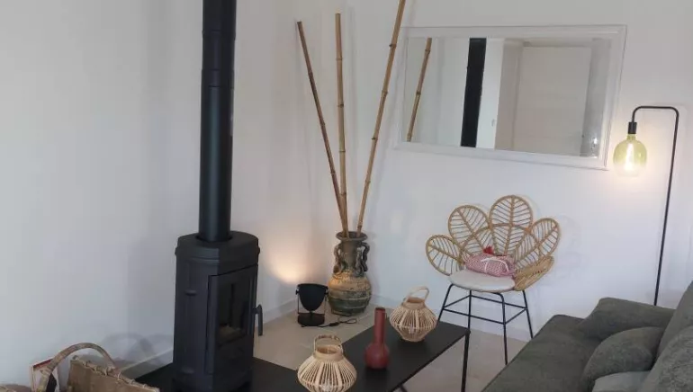 - a living room with lounge (sofa, coffee table, wood-burning stove (wood supplied included in the price), armchair, dining table with 6 chairs), fully-equipped open kitchen with bar and stools (integrated dishwasher, induction hob, extractor fan, food processors) and its technical area (oven, microwave, combined washing machine, tumble dryer, fridge, freezer),