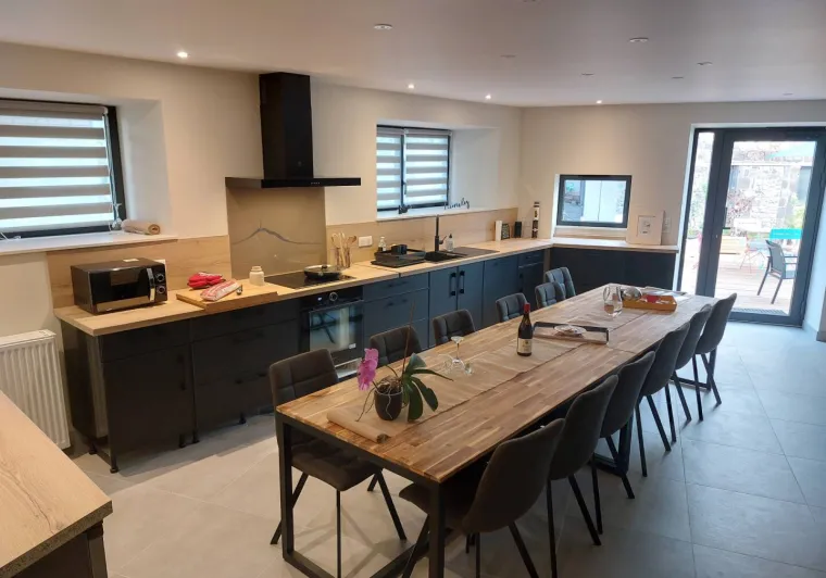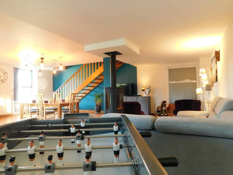Vous profiterez d'une grande pièce à vivre lumineuse et fonctionnelle avec une cuisine toute équipée donnant sur un espace repas salon avec jeux baby-foot, d'un poêle à bois pour partager des moments conviviaux.