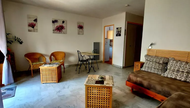 1 room apartment of 34 m2 on the 2nd floor with elevator for 2 persons. separate kitchen. Linen provided free of charge. Bicycle storage and private parking. South terrace in quiet residence with parks and tennis. A 3 km from the sea and 700 m from shops.