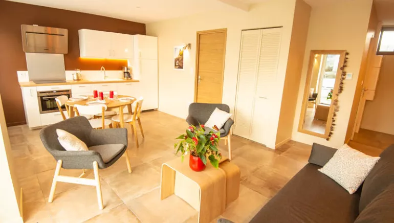 La Marelle est baignée de soleil grâce à ces grandes baies vitrées. La pièce de vie dispose d’une magnifique vue sur les sommets environnants. La terrasse privative contient un espace repas et quelques transats.