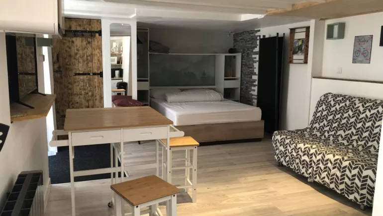 Cette maison située en milieu rural, le gîte à un plafond bas (1,80 m). Son accès s’effectue par une servitude depuis le rez-de-jardin, accessible via quelques marches, avec une terrasse fermée et privative. Le gîte allie minimalisme, praticité et confort, évoquant l'ambiance chaleureuse d'un mobil-home.