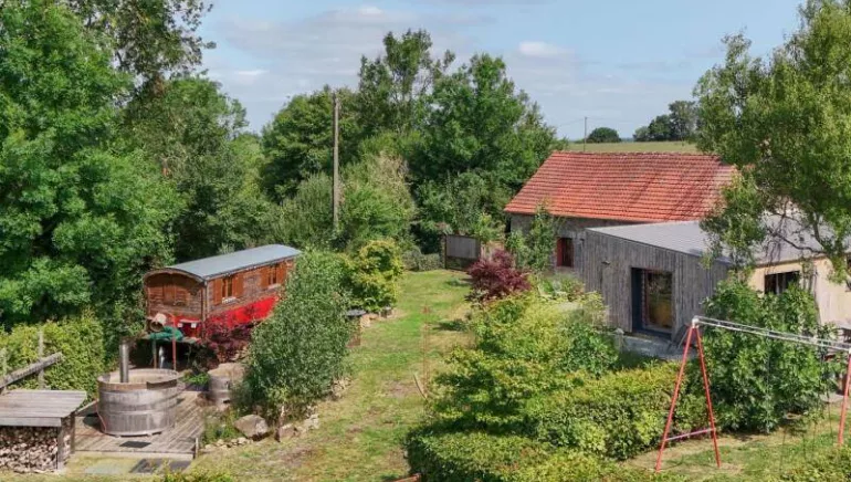 Independent and isolated house. Ground floor: large living room with lounge and fitted kitchen (pellet stove), bedroom with trellis over corridor window (double bed 160 cm), bedroom (double bunk bed with single bed), bathroom water, separate WC. 2 terraces. Pellet and electric heating. Spring water supply. SCANDINAVIAN BATH 40°c exterior 6 people that you will have the joy of setting out (around 3 hours) for 3 evenings. POOL (9.3x3.5m, depth 1m20) private from 9 a.m. to 6 p.m. (shared with owner beyond) + 10 p.m. for 2 nights, and heated from May to mid-September. Terrace 100 m2. Swing, WEBER gas barbecue. Land with small, partially enclosed garden surrounded by meadows. Price for 5 people. If exceeded: supplement of €40/person/day. In addition Bohemian caravan (double bed 160 cm in alcove): €290/week, €120/weekend and €60/night extra, opposite the gîte, exclusively rented with the gîte. OR A CAPACITY: 7 PEOPLE IN TOTAL.