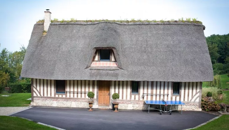 This real Norman thatched cottage respects the traditional housing codes. It offers a current layout and comfort. Charm and sweet life await with a beautiful terrace and an exceptional view over the Seine's estuary and the Pont de Normandie. Ground floor : entrance hall, living room with kitchen area, bedroom (1 separable double bed 180x200 cm), shower room, wc. 1st floor : 2 bedrooms (2 separable double beds, 1 single bed), bathroom, wc. 2 other gites (7-8 pers.) on-site (ref 958 and 959). Heated indoor swimming pool on-site (April to October), to share with gites 958 and 959. Professional dryer common to the 3 Gîtes on request.