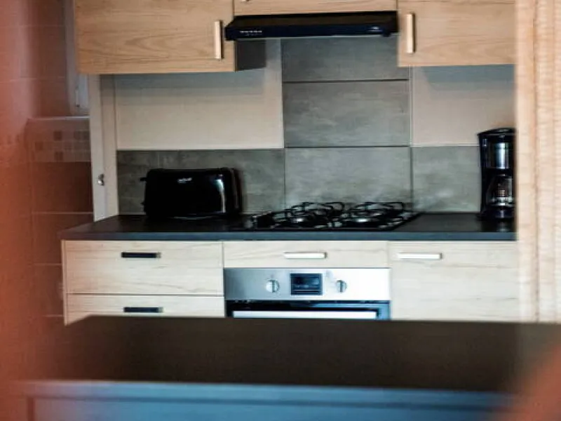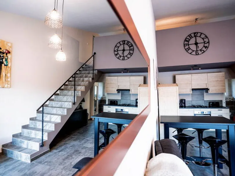 *an open-plan kitchen equipped with crockery, cooking utensils, oven, microwave, gas hob, extractor hood, fridge with freezer, 2 coffee makers, toaster, kettle, electric griddle, table and chairs.