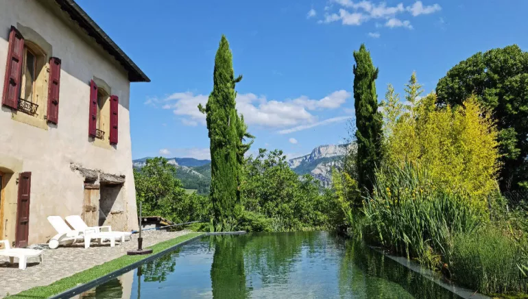 Le préau avec une grande table pour des repas d'extérieurs, une terrasse avec pergola ombragée par une vigne, vous aurez la possibilité de cuisiner au barbecue ou dans le four à bois, et vous pourrez admirer une vue magnifique sur le Vercors au bord de la piscine naturelle.