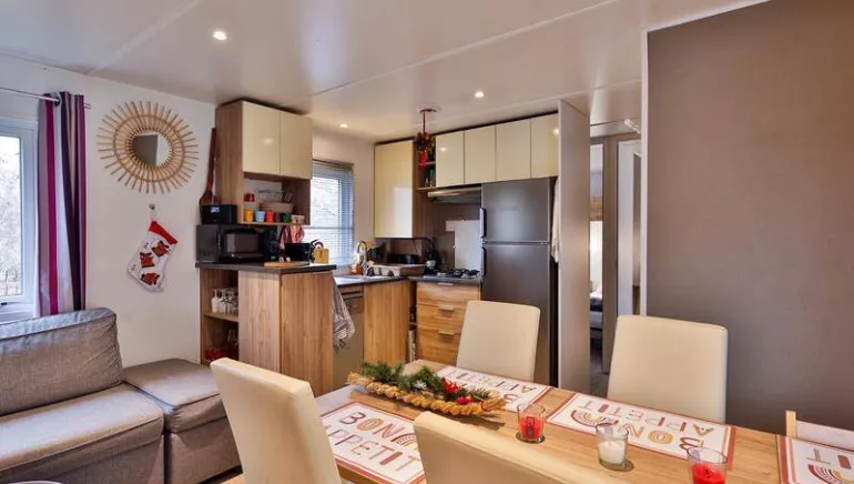 New, top-of-the-range mobile home on the river side of the Parc de la Fecht, comprising 3 bedrooms (1 double bed 160x200 in master suite, 2 single beds 80x190 and 2 pull-out beds 70x190) with 2 bathrooms and 2 WCs, reversible air conditioning, heating in all bedrooms, fully equipped, TV, covered terrace with garden table and plancha available. Each bed comes with pillows, blanket and comforter (sleeping kit, sheets and towels optional). 4-season insulation. Nespresso, Senseo and filter coffee makers. Carafe filter. Free WIFI. Washing machine.