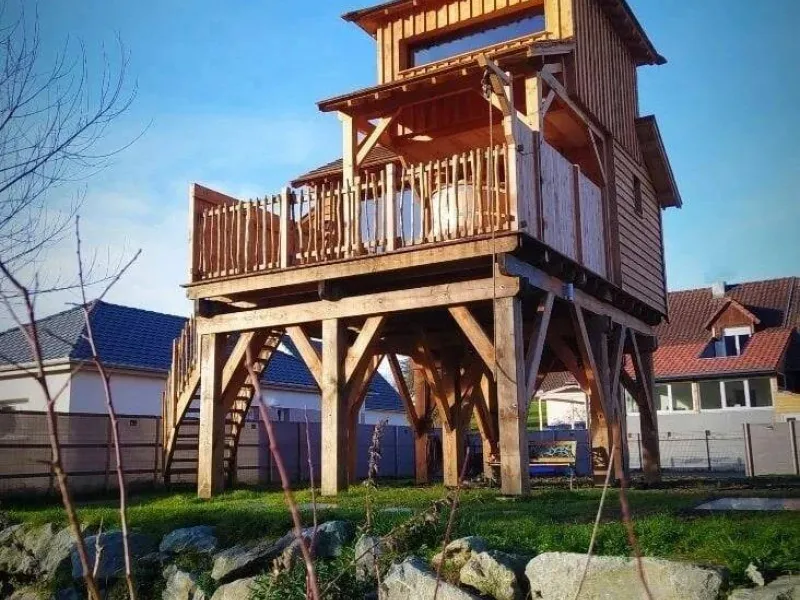 The cabane au bain perché is a cabin on stilts, it stands between two residential buildings in the tiny rue des lys in Aspach. This real chalet has been designed so that its occupants feel isolated from the world, the windows on both sides are hammered to let in only the light and the terrace's breezes allow total intimacy.This atypical but nevertheless comfortable setting is even luxurious. The kitchen is fully equipped, the bathroom has an Italian shower with Carrara marble walls, the headboard is a panoramic view of the surrounding nature and on the terrace there is the Nordic bath, a hot water bath outside with a view of nature.