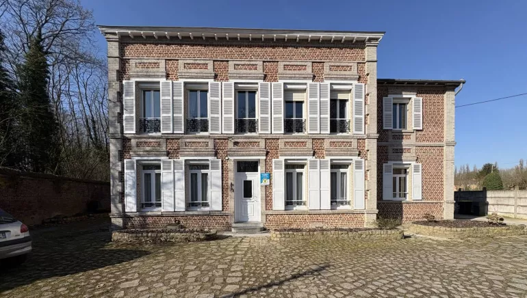 The open-plan dining room with fireplace and the lounge/library open onto the veranda and a pleasant, peaceful garden set in 3000 m² of south-facing grounds at the gateway to the Parc des Berges de la Souchez.