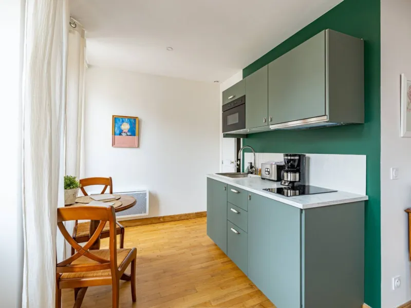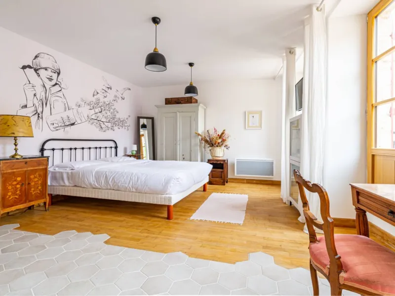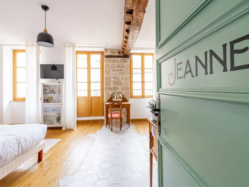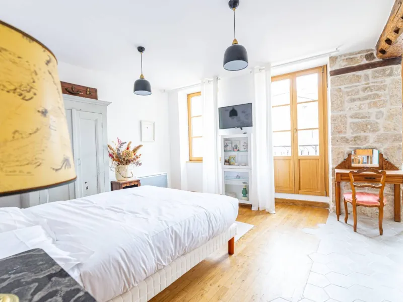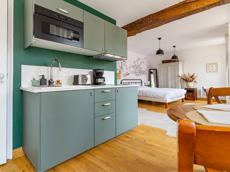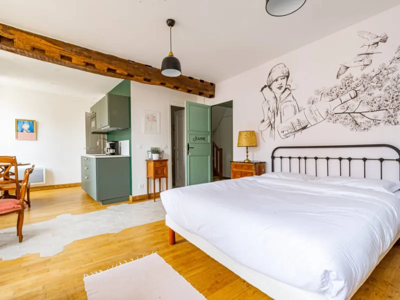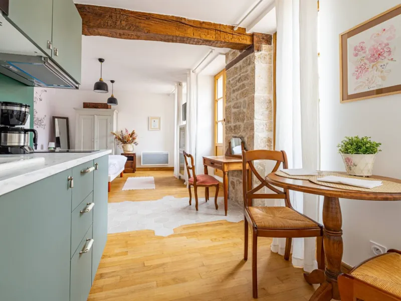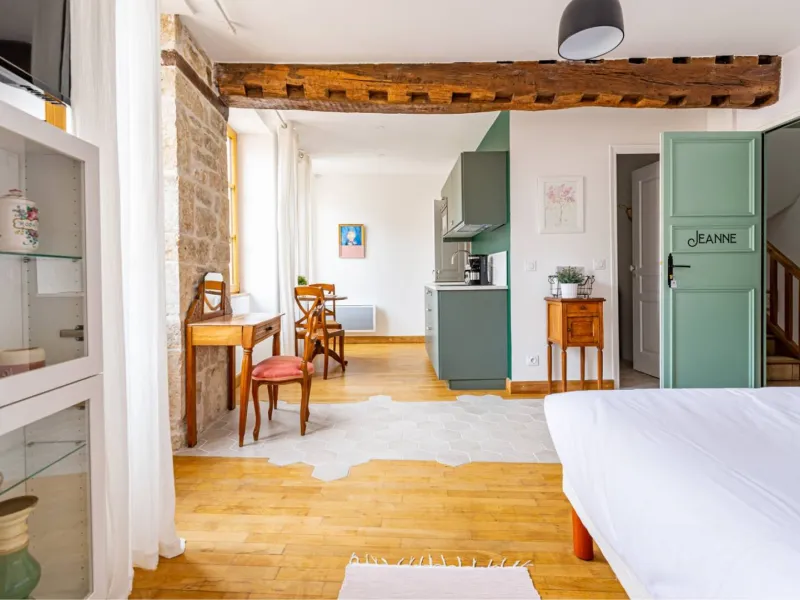 Composed of a large Queen size bed, a fully equipped kitchen, a bathroom with a large Italian shower (separate toilet), the JEANNE lodging benefits from a beautiful light thanks to its four windows, one of which opens onto a pretty balcony which leads onto the Place des Anciennes Halles and the café's terrace. On request, we can provide you with a cot, a nice cot and/or a high chair for your baby free of charge. During your stay, if you require extra cleaning, please select the "extra cleaning" option when you make your reservation. Upon arrival, we will schedule the day of your choice together. Breakfast and tapas are served in the bar of La Maison George. A take-away formula to be enjoyed in your room is possible on request! Ask at the bar directly on arrival.Localisation