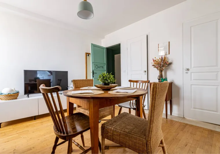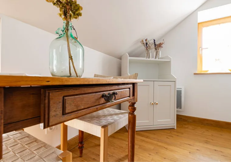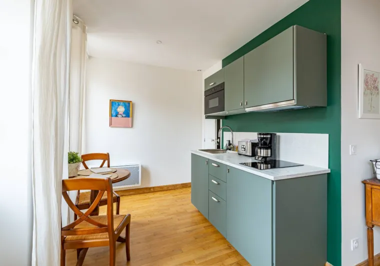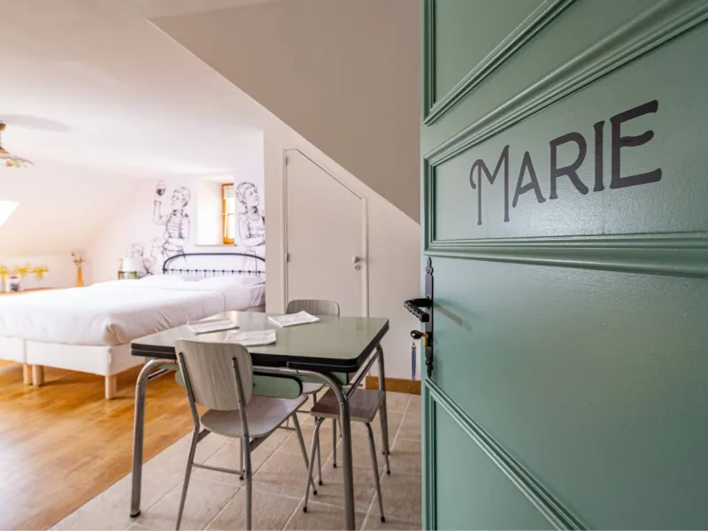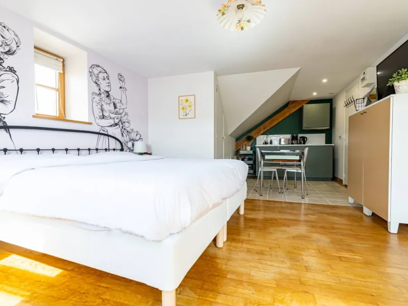 Composed of a king size double bed (possibility of separate bedsprings), a sofa bed, a fully equipped kitchen and a bathroom with a large Italian shower (separate WC), the MARIE apartment is ideal for a family with a child or for three friends (three separate beds). The studio is very pleasant with a beautiful luminosity (sunset on the valley) and nice views on the village. On request, we can provide you with a cot, a nice cot and/or a high chair for your baby free of charge. During your stay, if you require extra cleaning, please select the "extra cleaning" option when booking. Upon arrival, we will schedule the day of your choice together. Breakfast and tapas are served in the bar of La Maison George. A take-away formula to be enjoyed in your room is possible on request! Ask at the bar directly on arrival.Localisation