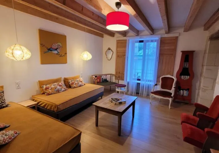 The dwelling is located in the heart of the wine area and yet so close to the centre of the magnificent medieval town of Chinon (another 7-person gite close by). You will benefit from an exceptional view of the Royal Fortress, a historic landmark in France, and of the valley. The grounds will allow you to enjoy the joys of the outdoors and the tranquillity of the place. In this location in Rabelais country where gastronomy, wine and culture go hand in hand, you will enjoy the proximity of the Loire Valley châteaux among others (Azay-le-Rideau, Le Rivau, Rigny-Ussé, Saumur) and also the Royal Abbey of Fontevraud and the Cardinal's town of Richelieu. The estate's organic wine is a must to try!Localisation