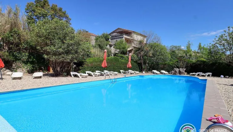 'Le Mas', 13km from Vallon-Pont-d'Arc, the Ardèche Gorges and Grotte Chauvet, comprises 6 gîtes which can be booked singly or in multiples to accommodate 20 to 28 people, depending on time of year. Ideal for holidays with family or friends. Large swimming pool (18x6m, 2.5m diving pit, children's paddling pool), open May to September. Enclosed parking area. Shared washing machine (extra charge). Accommodation for 8 people if Mathilde gîte booked at same time.'Christelle' gîte. Studio (20 sq.m.) in small, self contained outbuilding. Double sofa bed, shower room, separate kitchenette opening onto terrace (18 sq.m.), view of countryside. Availability and special deals on owner's website. Baby equipment (extra charge). Heating: 6€/day.