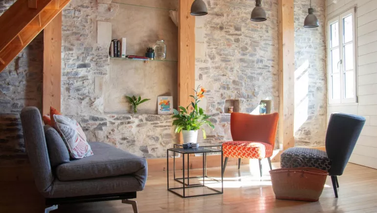A terraced barn conversion, restored using original materials, at the heart of the historic centre of Ancenis, close to shops and restaurants, opposite the castle and 80m from the banks of the Loire. This modern, comfortable ecogite is on the first floor. Small, walled garden of 35m². 1st LEVEL : Lounge-diner with open-plan kitchen. WC. Bedroom 1 : king-size bed, quality sofa bed, en-suite shower room with WC. 2nd LEVEL : Bedroom 2 (glass wall) : twin beds, en-suite shower room. Additional facilities : WiFi, DVD player, radio/CD, games console, Orange TV, 6 bikes. Garage. Price includes gas heating, electricity, all linen, local tourist tax.