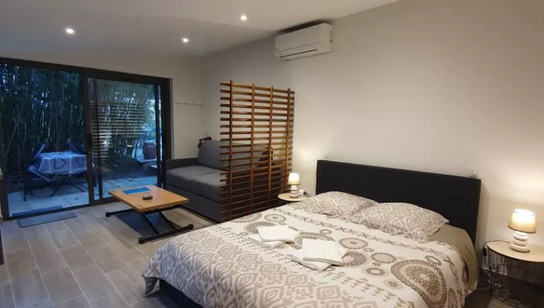 • Extérieur privatif : profitez d'une terrasse privée avec salon de jardin, nichée au cœur de la bambouseraie, offrant fraîcheur et intimité. Un accès arrière avec transats est également disponible.
