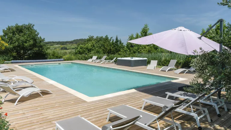 The landscaped park, enhanced by a small pond, invites relaxation. You will also enjoy a fully equipped summer kitchen with barbecue, plancha, and pizza oven, as well as a large table under the shaded pergola in front of the house. Finally, the heated swimming pool (14 × 6 m), jacuzzi, solarium, and pool house complete this setting dedicated to leisure and relaxation.