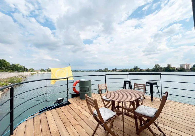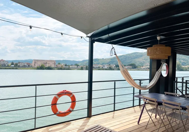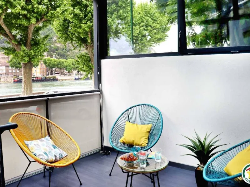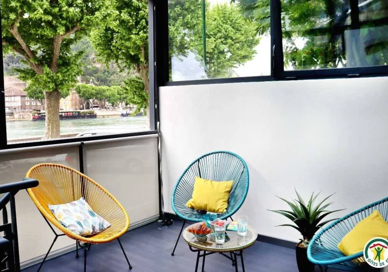 "Regard sur le Fleuve" is a waterside vacation home located in the heart of Tain l'Hermitage, in the historic and architectural center of the old town. Enjoy the exceptional view: the house's contemporary veranda faces the Rhône, the vineyards and the Château de Tournon, which you can reach via a suspension bridge reserved for pedestrians. From here, everything is accessible on foot or by bike. This is the ideal place to stay for a vacation. It's a central location for discovering the Drôme des Collines, the Drôme Provençale, and immersing yourself in exceptional places like Royans, Vercors or Diois, so close and yet so different at the same time. Direct access to the ViaRhôna. Electric bikes can be hired for our gîte guests (available in the garage).Downtown gîte on 3 levels, with access via a staircase to the veranda. Large living room with kitchenette on ground floor. On the second floor, TV and home cinema lounge with a 2-person bedroom with 140x190 bed, private bathroom and WC, on the second floor, a study with board games and a second bedroom with 2-person 140x190 bed, private shower room with WC. Veranda terrace overlooking the river. Private basement garage.