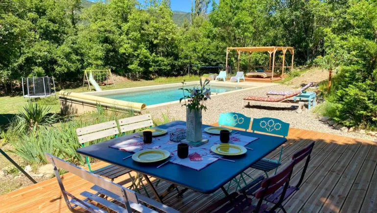 Independent gîte. First floor: fitted kitchen opening onto the living room, dining area, lounge with sofa bed (1x140), access to bedroom with double bed (1x160), bathroom and toilet. Upstairs: three bedrooms, one with two single beds (2x90), one with a double bed (1x160) and one with three single beds (3x90), shower room, wc, second kitchen area and living room. Private swimming pool (10x5m, unheated, open May-September, weather permitting), pétanque and volleyball courts. The Ouvèze river beside the gîte is a popular spot for swimming. On the wings of the season, upstairs heating is provided by electric space heaters. Good 4G coverage. Parking on the property. Our gîte, located in the heart of the Parc régional des Baronnies Provençales, is part of an eco-responsible approach. This involves reducing energy consumption, using renewable energies, eliminating plastics and using ecological cleaning products. The hosts strive to maintain the 2-hectare garden using permaculture, i.e. in harmony with surrounding nature, multiplying fertile interactions and employing elements that fulfill several functions in order to move towards a form of self-sufficiency. Light pollution is virtually non-existent, and the sky is of exceptional quality. Nearby attractions include Provencal markets, hilltop villages, the wine route, the thermal baths of Montbrun les Bains, river swimming in the Ouveze next to the gîte, rock climbing, via ferrata, hiking and mountain biking. Close to Mont Serein, Mont Ventoux, Avignon, Orange and Vaison la Romaine.