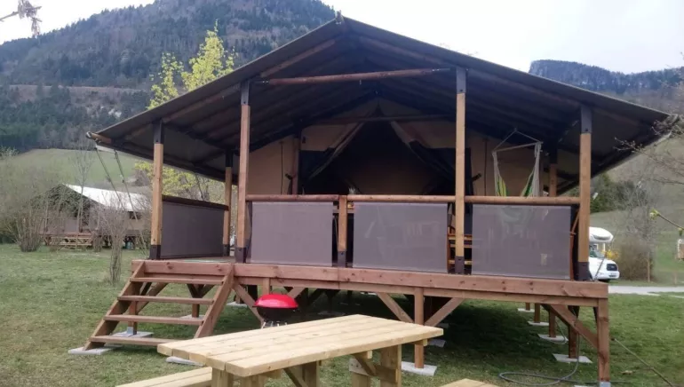 This canvas-and-wood Altitude Lodge features a large living area, a spacious covered terrace and high-quality, fully-equipped accommodation for 5 people.