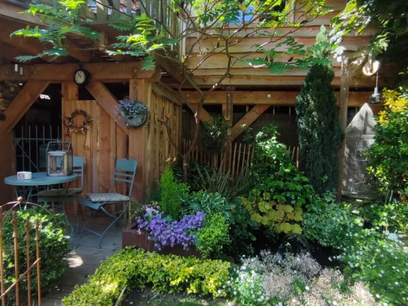 A bay window opens onto a private terrace of 7m² on stilts, covered by a glass roof overlooking the garden and pond. It offers a view of our stone house. A staircase leads to a second shaded terrace on the garden level, ideal for relaxing and enjoying nature.